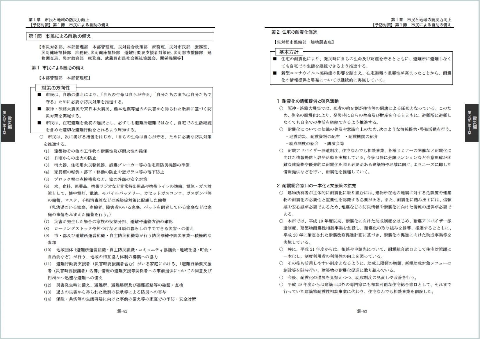 本業務は、国の防災基本計画(令和元年度改正)や、東京都の地域防災計画(震災編・火山編)などの上位計画、また災害対策基本法をはじめとする関連法令の改正を踏まえ、武蔵野市の地域防災計画を最新の知見に沿って適切に修正することを目的として実施しました。加えて、形式的な修正にとどまらず、市の実情に即した「実効性のある防災計画」への転換を重視。関係部署や団体へのヒアリング、市民との意見交換、市議会報告など、多様な関係者との調整を丁寧に行い、計画の社会的合意形成を図りながら見直しを進めました。【特徴】