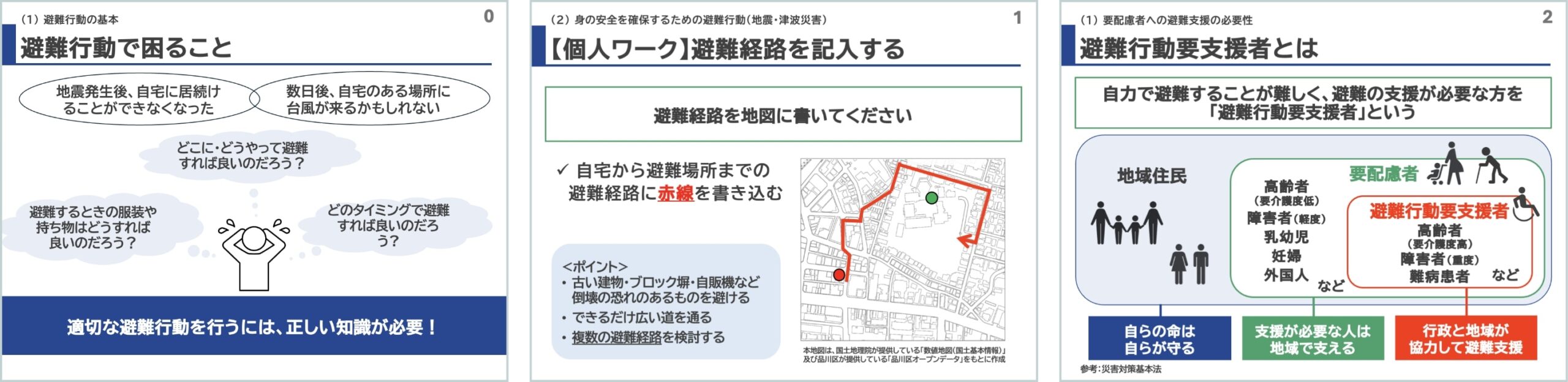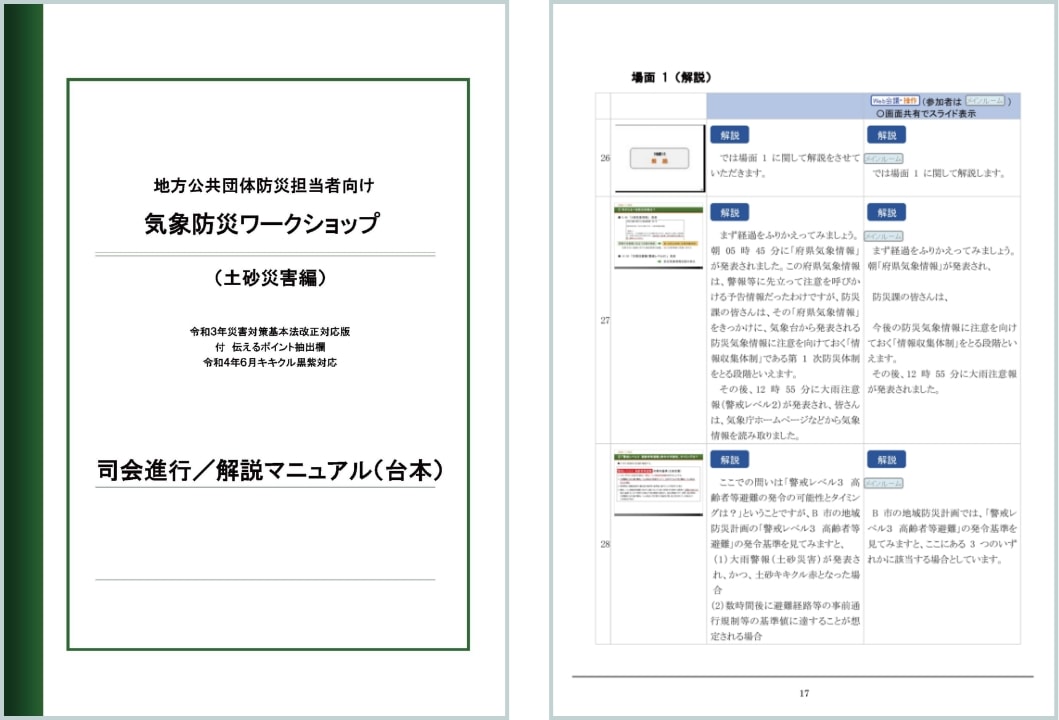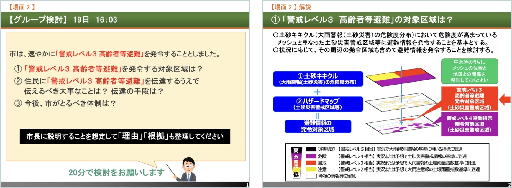 - 自治体が自走的に運用できるよう、事前学習資料、スライド教材、状況付与資料、司会進行・解説者用マニュアル(台本)を一体的に整備