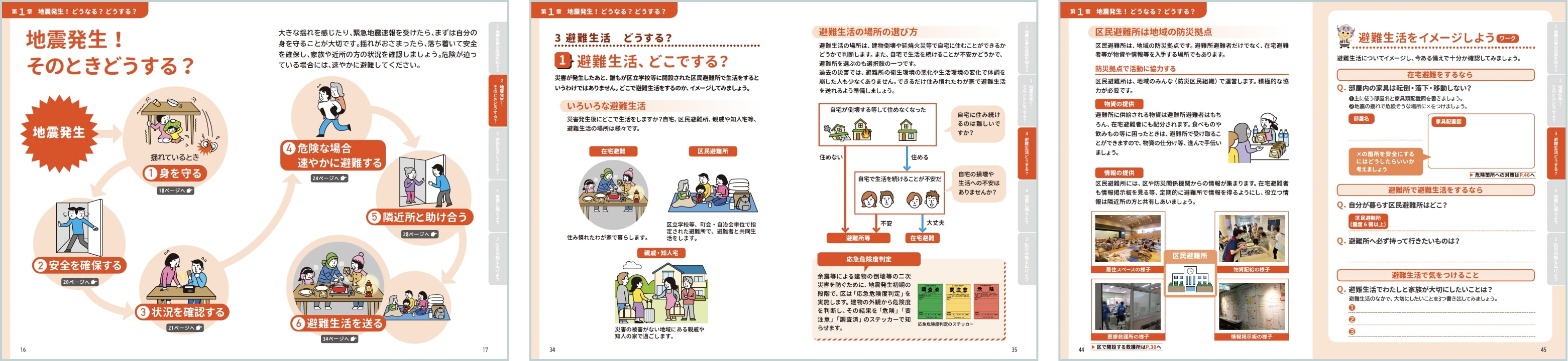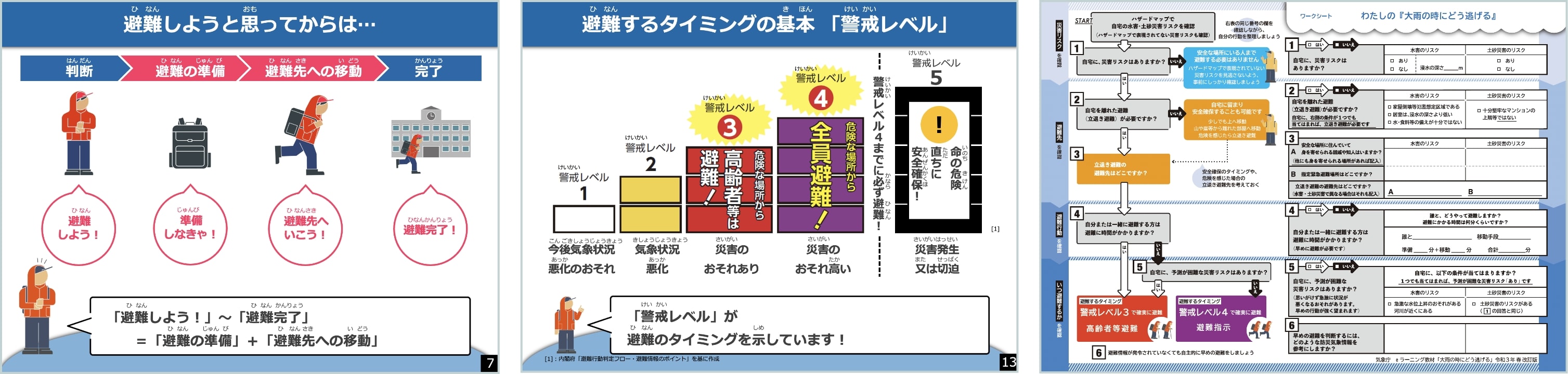 教材は、台風・豪雨時に必要な行動や基礎知識を、動画とワークシートを通じて段階的に学べる構成。個人学習だけでなく、自治会や学校などでのグループワークにも対応しており、ワークシートを活用した意見交換を通じて、避難行動の見直しや理解の深化を促すことができます。